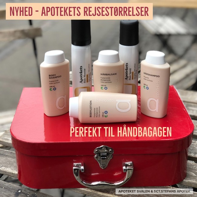 Vi ønsker jer alle en god ferie med denne NYHED: apotekets 100ml rejsestørrelser af de populære parfumefri hår-shampoo og balsam, body-shampoo og lotion, hår-spray og mousse. Alle er perfekte i håndbagagen😊